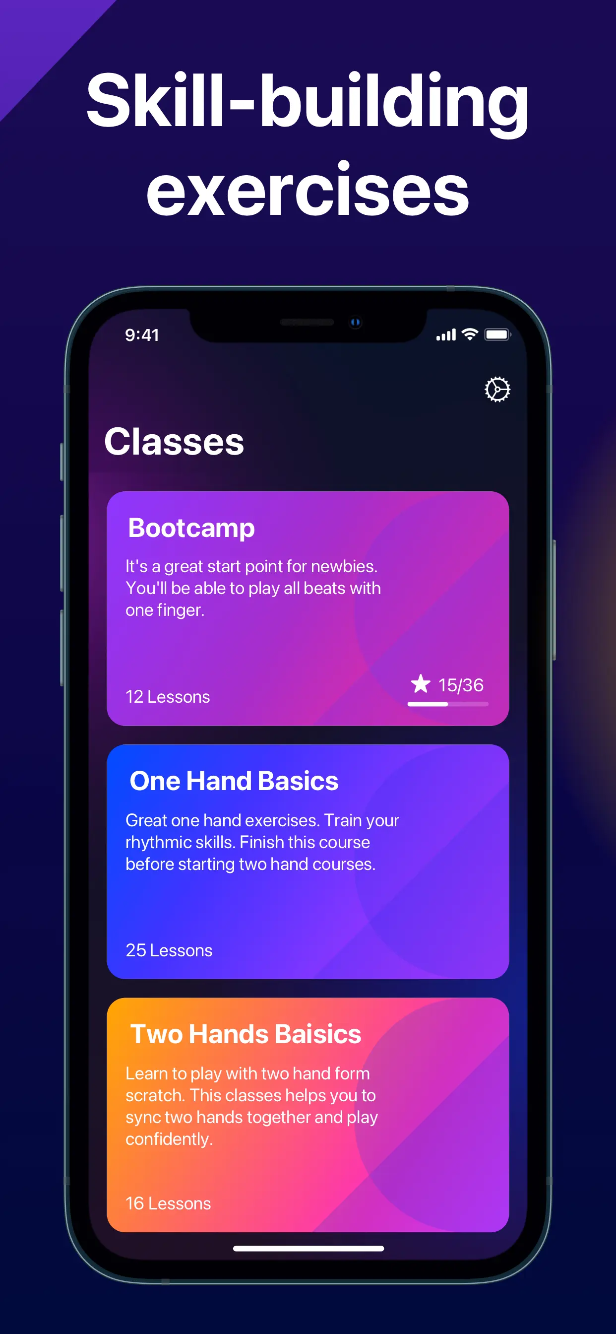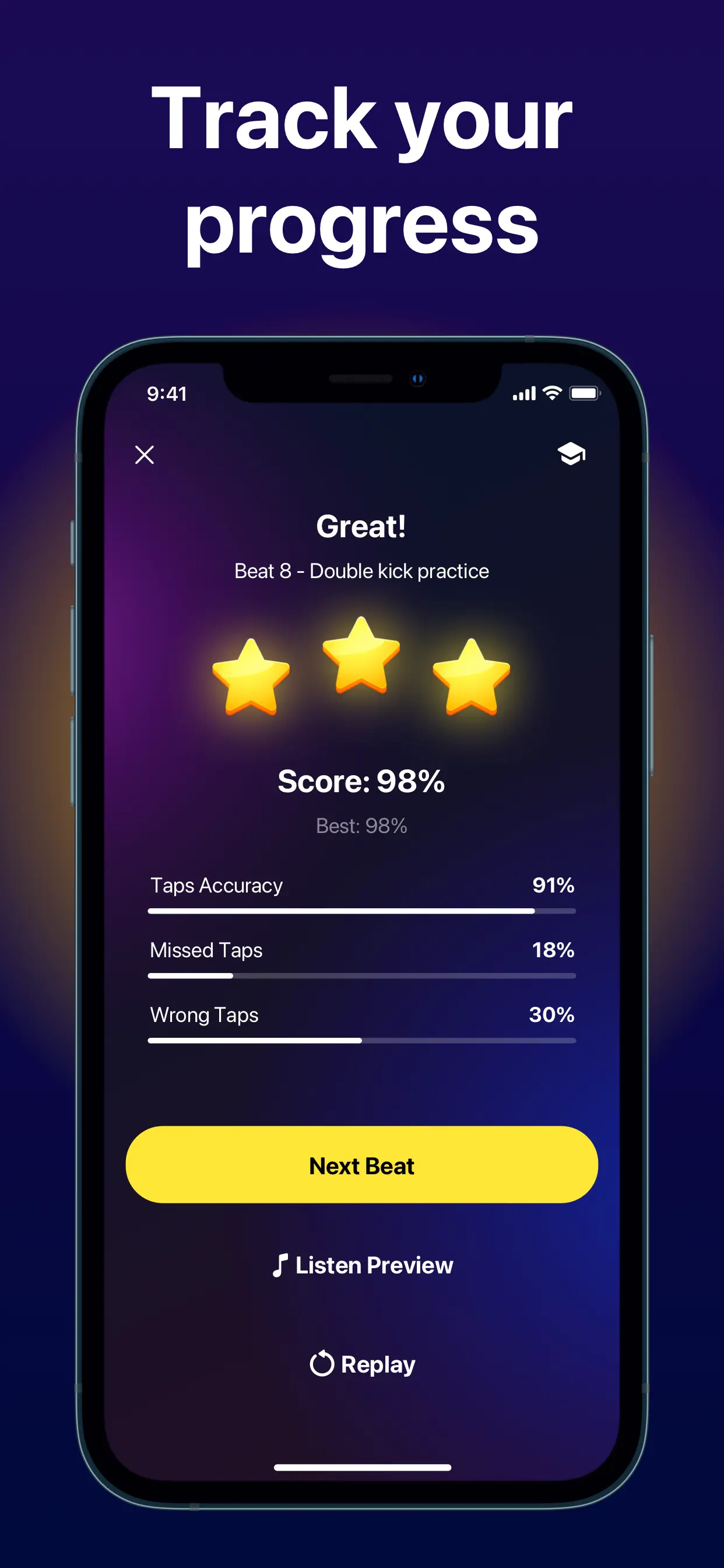 • Different modes: use tutorial mode to watch how to play the lesson. Use step-by-step mode to learn the rhythm. Use live mode to challenge yourself.